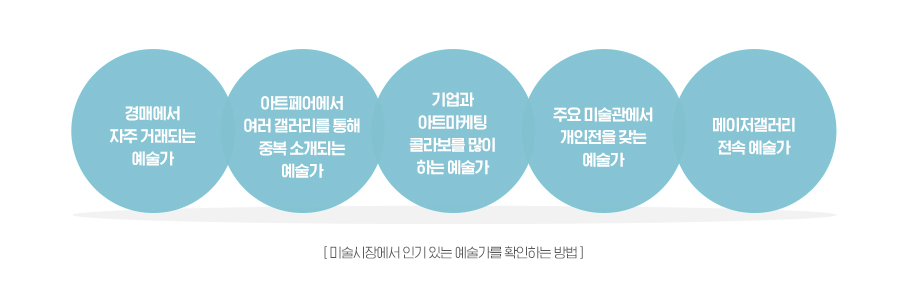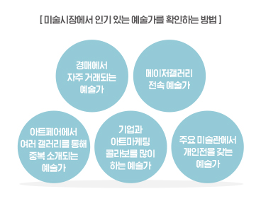 수많은 미술시장 전문가들이 미술품컬렉션에 성공하기 위해서는 우선 자기가 좋아하는 작품을 선택해야 한다고 조언합니다. 그러나 미술품을 고르는 목적이 내가 좋아하는 미술품을 구입하고 집안을 장식하는 것 이상이라면 미술시장에서 다수의 컬렉터에 의해 사랑받는 예술가의 작품을 선택해야 합니다. 오랫동안 미술시장에 관심을 갖고 미술공부를 하다 보면 과거에 예쁘게만 보였던 알록달록 정물화나 풍경화, 팝적인 그림들이 유치하고 조악해 보이고, 어느 순간 어렵게만 느껴졌던 추상화나 설치미술품에 큰 매력을 느끼게 될 수 있습니다. 이렇게 개인의 취향이 변하더라도 다행히 자신이 소장한 그림 가격이 구입 당시 가격보다 오르고, 자신이 원하는 가격에 자신이 소장했던 작품을 사 줄 수 있는 자신과 취향과 비슷한 새로운 컬렉터를 찾을 수 있다면 보상이 될 것입니다.