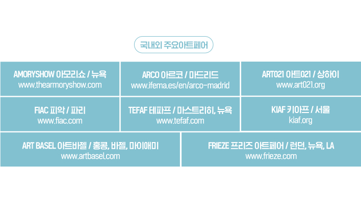 갤러리들이 한 공간에 모여 특정 기간 동안 동시에 작품을 판매하는 소위 미술 장터라 할 수 있는 아트페어는 미술시장의 트렌드를 읽기 좋으며 수많은 작품을 한자리에서 비교해 보고 작품을 구매할 수 있다는 장점이 있기도 합니다. 온라인미술품거래플랫폼을 이용하면 시간과 공간의 제약으로부터 자유롭게 국내외 미술품을 구입할 수 있습니다. 국가나 지방자치단체, 공공기관이나 금융기관이 소유했던 미술품을 사고 싶다면 캠코의 온비드를 활용할 수 있습니다. 이처럼 미술품을 구입할 수 있는 경로가 다양한 만큼 실패하지 않는 미술컬렉션을 원한다면 기본적으로 각 미술시장이 갖는 특징을 이해하고 각 미술시장의 특성에 맞는 접근이 필요합니다.