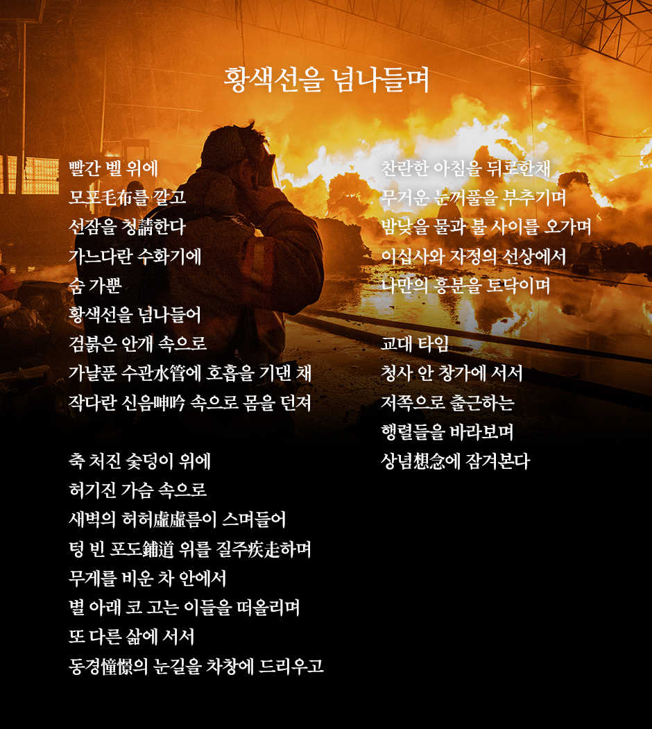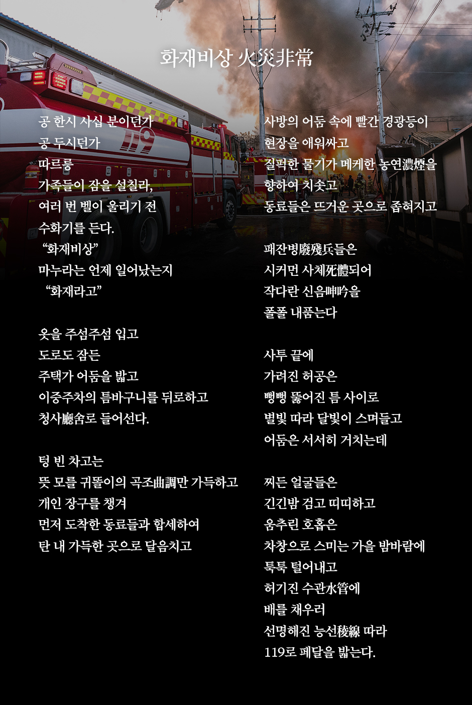 나의 시(詩)는 나만의 이야기가 아니기에 한솥밥 먹다가 먼저 가신 님들에게 조금이나마 빚을 갚는 마음이라고 생각한다. 내 언젠가 기력이 다하여 호흡의 연장이 간절하여 119 버튼을 누를 때 달려 와줄 후배들에게 작은 힘을 주고자 함이다. 내 가족의 절규라 생각하며 달려가는 119 전사들이여, 이제는 앞에서 당겨주는 선배가 되고 싶다. 코로나19가 발병하여 오늘까지 모두가 어려움에 동분서주하고 있다. 새해에는 이 난국이 하루빨리 타개되기를 간절히 희망하며 서로가 서로를 생각하자는 의미에서 고교 시절 선생님이 들려주신 이야기를 시상화하며 끝맺음한다.