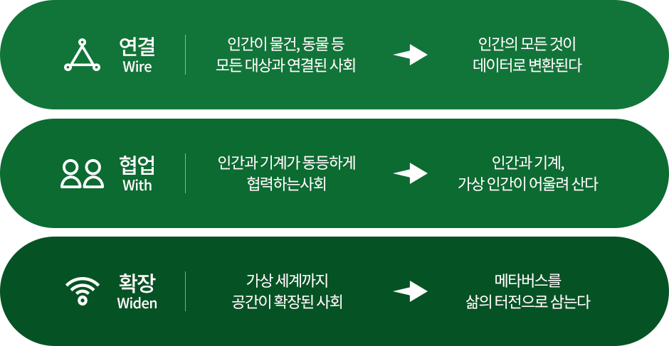 우리는 이미 AI 기술을 기반으로 만들어진 가상 인간이 출연하는 광고를 TV를 통해 만나고 있으며, 많은 SNS 팔로워를 보유한 가상 인간도 어렵지 않게 찾아볼 수 있는 사회에 살고 있다. 그리고 이들은 자영업자를 도와 손님의 예약 전화를 대신 받아주고, 돌봄과 관심이 필요한 독거노인을 위해 안부 전화를 걸어주는 사회복지사 역할까지 대체하고 있다. 게다가 AI 기술은 우리가 살고 있는 사회적 공간을 확장하고 있다. 예를 들어, AI 소사이어티의 시민들은 메타버스 공간으로 출근하고 새로운 친구를 만들기 시작했다. 메타버스라는 가상공간으로 확장된 사회에서 AI의 역할은 더 중요해질 것이다. 새로운 사회적 공간에서 AI는 10년 전 영화에서 보던 사람 말을 곧잘 이해하고 소통하던 로봇이나 운영체제의 모습이 아니다. 인공지능에 대한 이질감은 기술의 발전으로 인해 계속해서 줄어들고 있으며, 이제 우리는 이들과 더 깊이 연결(wired)되고 협업(with)하는 확장(widen)된 사회에 살게 되었다.
