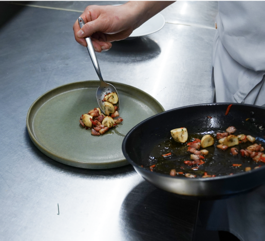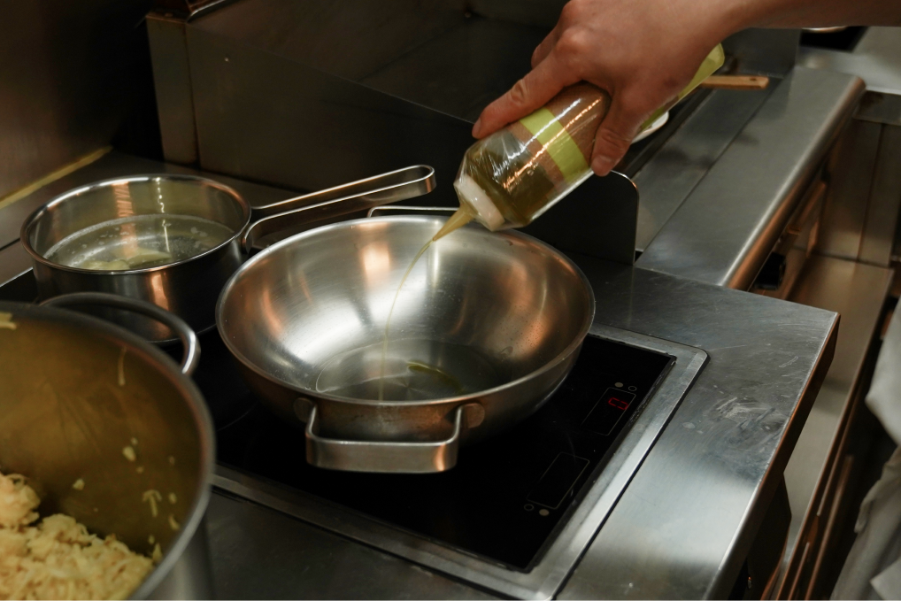 달구어진 냄비에 오일을 두르고, 양파채와 마늘을 부드럽게 볶은 뒤 모시조개와 화이트 와인을