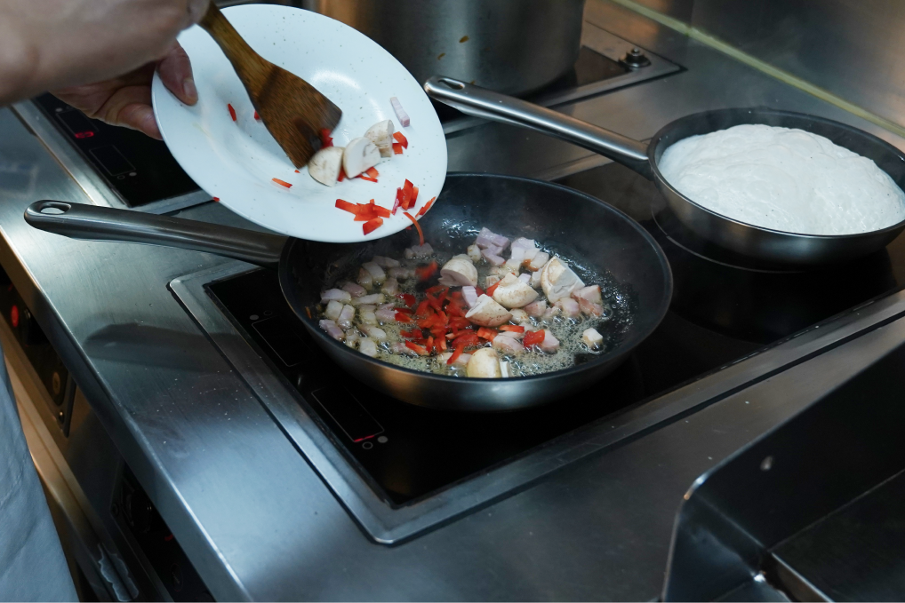 닭가슴살을 건진 뒤, 닭을 구운 팬에 다시 불을 올리고, 후추와 생크림을 넣어