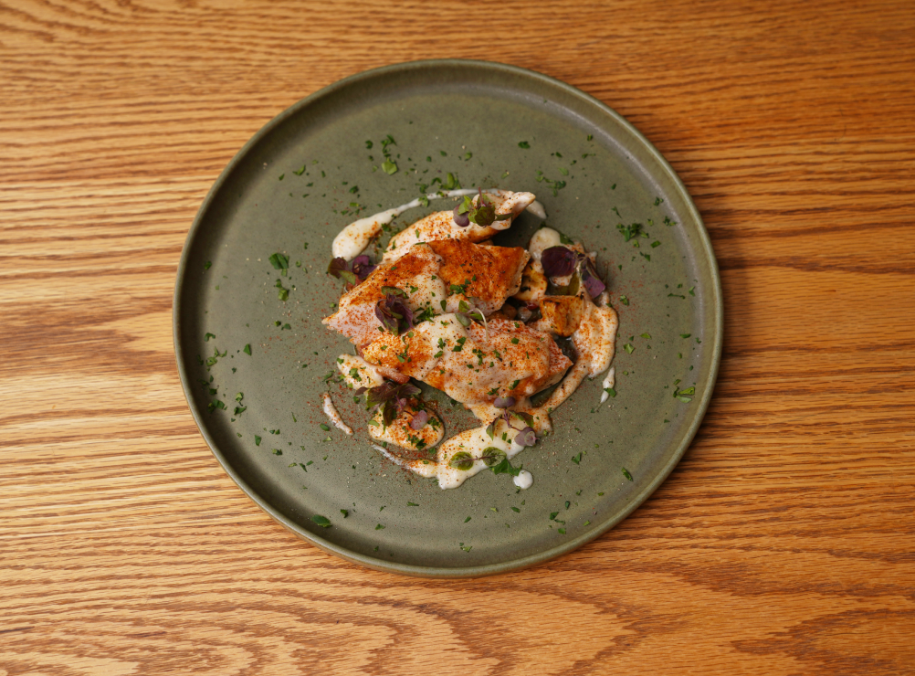 달구어진 팬에 식용유를 살짝 두른 뒤, 닭가슴살을 껍질이 있는 부분이 바닥을 향하도록 놓고 약불로
