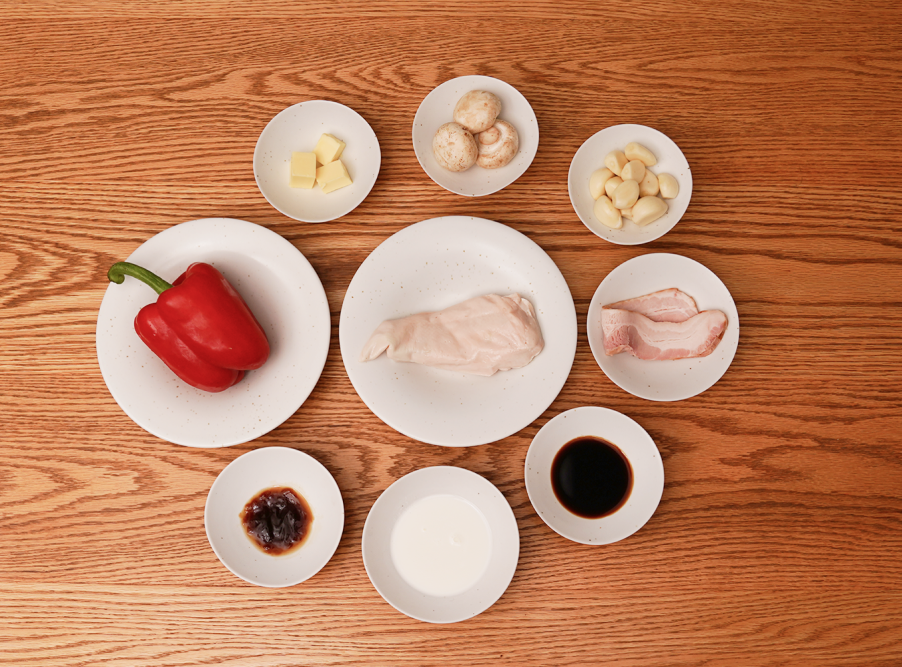 3. 베이컨 버섯 구이 위에 닭가슴살 구이를 사선으로 쌓고 그 위에 크림 소스를 스푼으로 뿌린다.