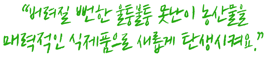 버려질 뻔한 귀한 제철 식재료를 이용하여 다채로운 저장 식품을 개발 및 유통하고 있습니다. 개인적으로도 음식물 쓰레기를 줄이고, 못난이 농산물의 생명을 연장해 준다는 뿌듯함이 큽니다.