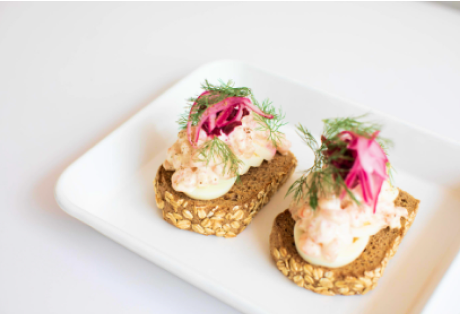 삶은 달걀과 새우 마요네즈를 올려준 오픈 토스트에