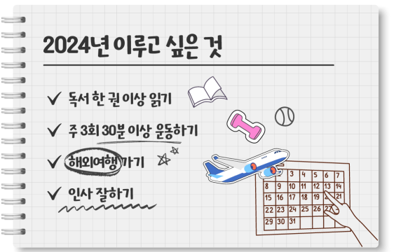 새해 목표를 세울 때 우리는 종종 크고 복잡한 목표에 집중합니다. 이러한 목표는 종종 우리에게 과도한 압박을 가하고 스트레스를 유발할 수 있습니다. 미니멀 라이프는 많은 목표보다는 간결하게 목표를 정하고, 중요한 일에 집중하는 것이 핵심입니다. 일단 빈 종이를 꺼내 2024년에 이루고자 하는 것들을 모두 적어보세요.