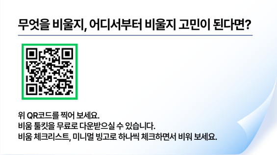 이렇게 가볍게 시작하면서 자신만의 비움의 기준을 만들어 보세요. 이 과정에서 나를 괴롭히던 잡념도 사라지고, 중요한 것에 집중하고 꼭 필요한 것만 남기는 법도 배우실 수 있을 거예요.