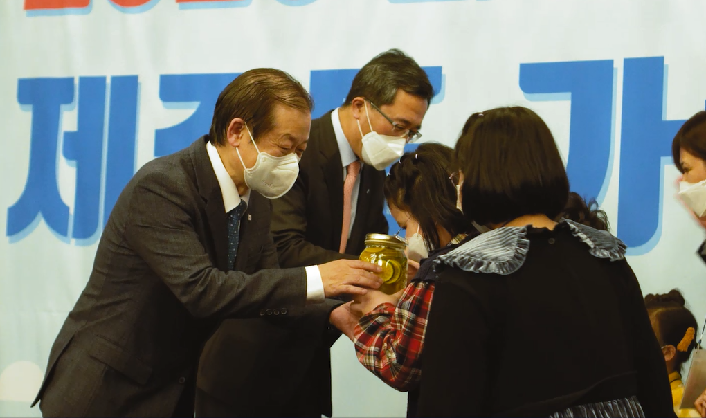 저녁에는 캠퍼트리 호텔에서 한국자산관리공사 문성유 사장과 대한적십자사 신희영 회장이 직접 참여한 가운데 ‘희망 리플레이 가족여행 기념식‘이 진행됐습니다. 이날 기념식에서 한국자산관리공사는 대한적십자사에 기부금 1억 원을 전달했고, 문성유 사장과 캠코 임직원이 농장에서 직접 따서 만든 한라봉청을 가족 모두에게 선물했습니다.