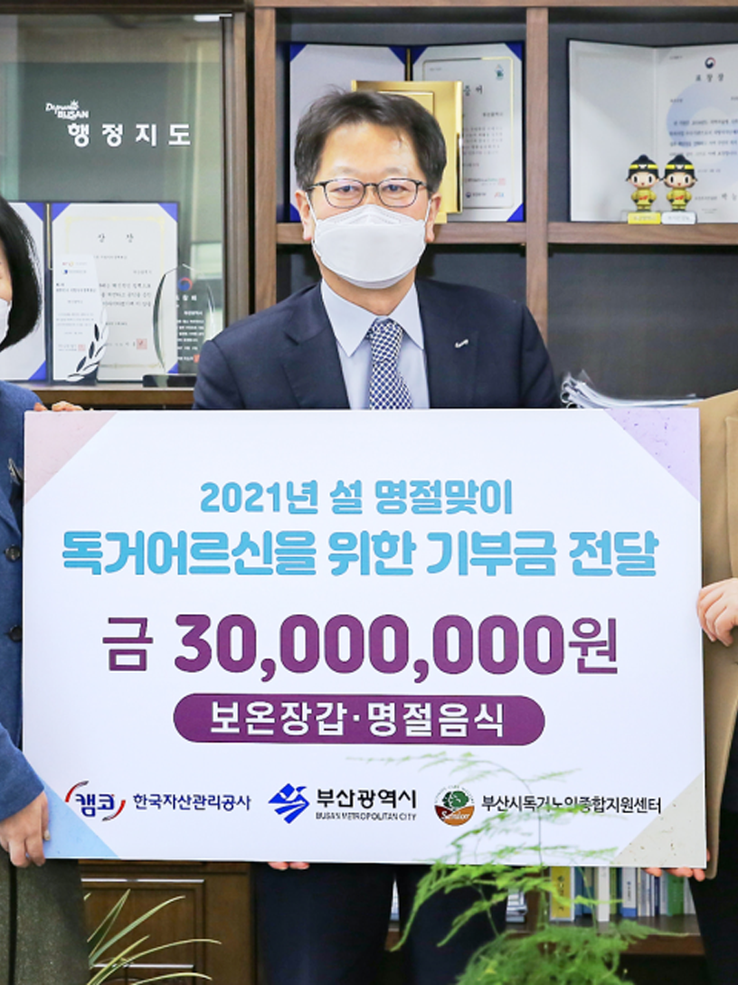 캠코, 독거노인 설맞이 선물 기부금 전달 캠코는 2월 8일(월) 오후 2시 부산광역시청에서 신흥식 캠코 경영본부장, 안병선 부산시 복지건강국장, 박선희 부산독거노인종합지원센터장 등이 참석한 가운데 설 명절을 앞두고 부산지역 홀몸 노인들을 위한 기부금 3천만원을 전달했다고 밝혔다. #따뜻한명절 #기부 #나눔