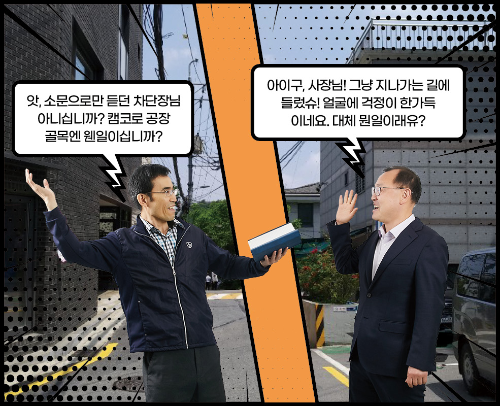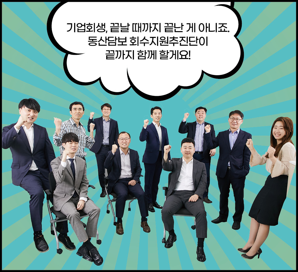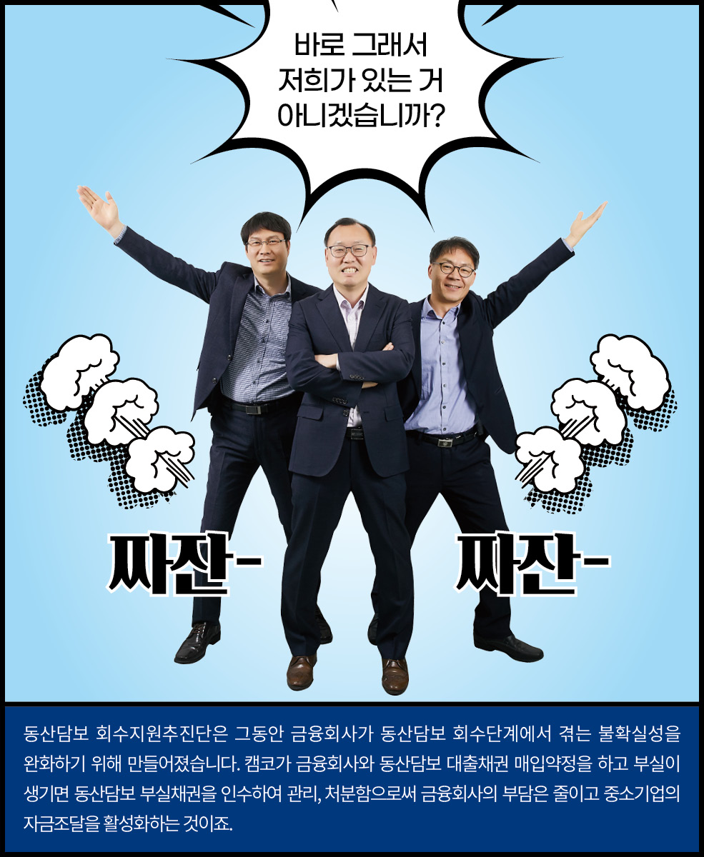 경기 침체로 어려움을 겪고 있는 캠코로 공장골목에 동산담보회수지원추진단이 찾아왔습니다. 중소기업을 살리기 위해 두 팔 걷어붙인 차단장과 막강 팀원들의 이야기가 지금 시작됩니다. 경기 침체로 어려움을 겪고 있는 캠코로 공장골목에 동산담보회수지원추진단이 찾아왔습니다. 중소기업을 살리기 위해 두 팔 걷어붙인 차단장과 막강 팀원들의 이야기가 지금 시작됩니다. BEHIND INTERVIEW 차상휘 단장모처럼 직원들과 함께 활짝 웃은 것 같습니다. 앞으로 직원들과 스스럼 없이 이야기 나누는 자리를 자주 마련해야 될 것 같아요. 다들 고생 많으셨습니다. 최종욱 팀장사진 촬영이 익숙하지 않아 조금 어색해했지만 반복되는 회사생활 속에 새로운 경험이라 즐거웠습니다. 동산담보 회수지원기구를 설립하면서 새로운 것들을 많이 배웠고, 이 회사가 앞으로도 안정적으로 운영되어 좋은 성과가 날수 있도록 노력하겠습니다. 이해진 팀장동산담보 회수지원 업무가 잘 홍보된 것 같아 매우 뿌듯합니다. 지금까지 모두 고생한 만큼 앞으로 알찬 결실을 맺었으면 합니다. 김인선 차장이제 얼굴이 알려졌으니 기계 홍보는 잘 되겠죠? 기계 이름만 들어도 용도와 가격을 알 수 있을 것 같은데요, 현금처럼 융통되는 기계 거래가 되도록 더욱 열심히 일하겠습니다. 이성엽 과장캠코에서 새롭게 시작하는 사업인 만큼 기틀을 잘 마련해 향후 캠코의 발전에 큰 기여를 할 수 있도록 노력하겠습니다. 오늘 화기애애한 시간을 통해 다시 한번 의지를 다지게 됩니다. 정민영 과장저는 캠코동산금융지원(주)를 운영하는 업무를 맡고 있는데요, 일전에 단장님께서 제 일을 비닐하우스로 비유하신 적이 있습니다. 사업이 좋은 열매를 맺을 수 있도록 알맞은 환경을 제공하는 일이 제 역할이라 생각하고, 잘 가꾸어나가겠습니다. 임경철 과장동산담보부 채권인수 업무를 맡고 있는데요, 과거 사례가 많은 부동산담보부 채권인수와 달리 인수금액 산정에서 매입 프로세스까지 다른 부분이 많습니다. 더욱 열심히 공부하겠습니다. 이가현 대리동산담보 회수지원추진단이 하는 일을 많은 사람들이 이해하기 쉽고 재미있게 설명하는 자리가 되었던 것 같습니다. 동산담보대출 시장 활성화에 기여하고 있다는 자부심을 잊지 않겠습니다. 위준 대리 동산담보채권의 인수와 정리 업무를 맡고 있습니다. 앞으로 시범 사업을 넘어 지속적으로 동산담보대출이 확대될 수 있도록 제 역할을 다하겠습니다. 안계진 대리캠코의 신사업을 알릴 수 있는 뜻깊은 시간이었습니다. 오늘을 계기로 다시 한번 각오를 다지며 동산금융시장 홍보 및 활성화에 최선을 다하겠습니다. 코스모스팜 소셜댓글