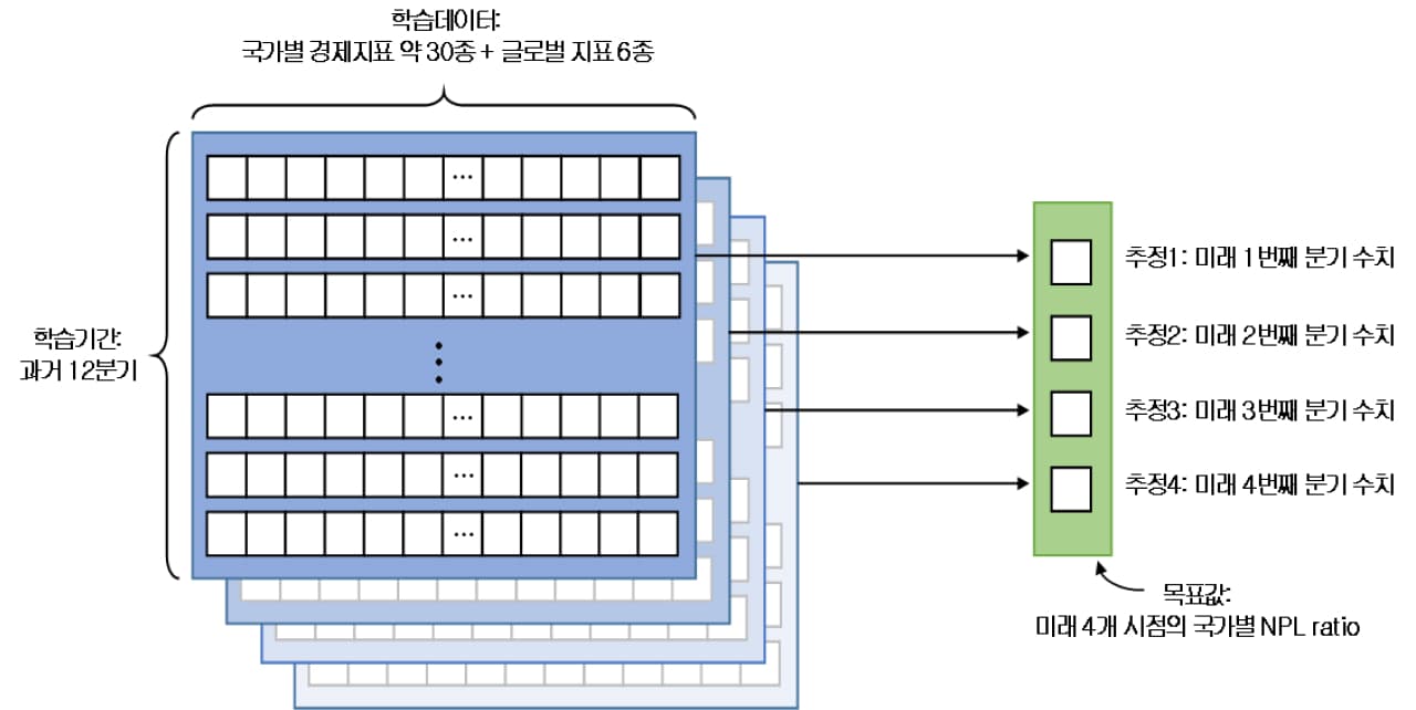 모형의 입력 값은 직전 12개 분기(3년치)의 경제 데이터로 한정했는데, 그 이유는 글로벌 금융위기와 같은 예외적인 경제 충격이 먼 미래에까지 왜곡된 영향을 미치는 것을 방지하기 위함입니다. 즉, 모형이 현재의 경제 흐름을 보다 정확히 반영할 수 있도록 너무 오래된 과거 정보는 배제하고, 최신 경제 동향에 기반한 예측을 수행하도록 설계됐습니다.