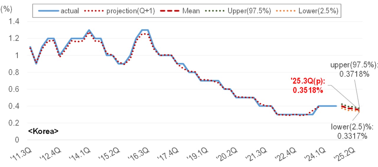 사후적으로 모형의 성능을 검증한 결과, 우리나라를 포함한 중국, 태국, 말레이시아, 인도네시아, 베트남의 부실채권 비율을 오차 범위 0.05% 이내로 산출해 우수한 예측 정확도를 보였지만, 몽골과 카자흐스탄의 경우 입력 데이터 값이 부족해 오차범위가 좀 더 크게 나타났습니다. 특히 우리나라의 경우 2025년 3분기까지 부실채권 비율이 소폭 하락할 것으로 전망됩니다.