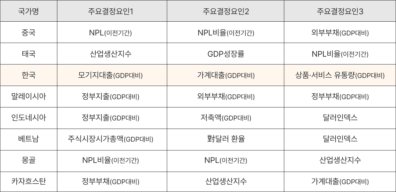 또한 국가별 부실채권 비율에 영향을 미치는 주요 결정 요인을 분석한 결과, 우리나라는 ‘GDP 대비 모기지 대출 비율’이 부실채권 수준을 결정짓는 가장 핵심적인 요인으로 분석됐습니다. 이는 국내 금융시장에서 부동산 관련 대출이 차지하는 비중이 절대적임을 반영한 결과로 해석됩니다.
